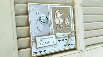 Used materials: Cut-ies Stamps Kip.ref: 20074 / Cut-ies Seahorse Kip.ref: 20068 / Marianne Design paperpad Driftwood Kip.ref: 10573 /Marianne Design Stamps Dreams Kip.ref: 10608 / Twine Kip.ref: 11169 / Kraft Kip.ref: 774 / Cardboard Kip.ref: 28129 / Sequins silver Kip.ref: 87879 / Buttons Kip.ref: 25495